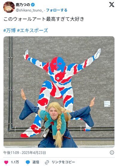2025年に開催中の大阪・関西万博でコスプレ姿で来場し、SNS上で話題になった鹿乃つのさん。