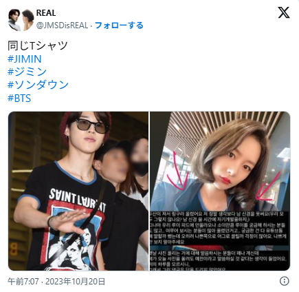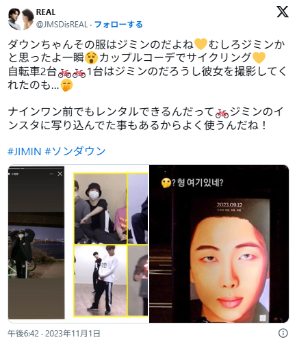 きっかけは、ソンダウンが自身のSNSにジミンを連想させる投稿や、同じ場所で撮影されたとみられる写真をアップしたことです。