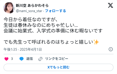2025年3月、X(旧Twitter)を開設し、「悩める21歳♀」として教師のリアルな日常をつぶやき始めます。