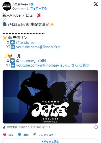 八九百Projectという新しい事務所からvtuber「天道サン」「一 月一」が2025年9月23日にデビュー!