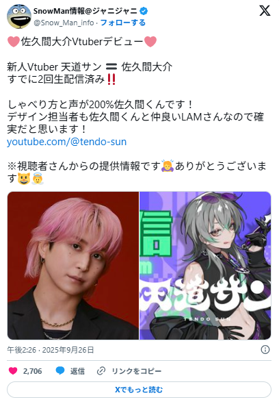 この関係性を考えても、天道サンさんの中の人がSnowManの佐久間大介さんであるという可能性は高い気がしますね。