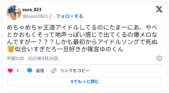 水音シオの推しマークは「🧂💤」で、篠宮ゆのの初ポストがこちら↓